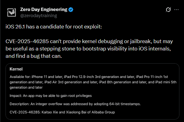 CVE-2025-46285 does not enable kernel-level debugging or a jailbreak on its own. However, it can still be valuable as an initial foothold  helping researchers gain limited insight into iOS internals and potentially uncover another vulnerability that can be leveraged for deeper access.
